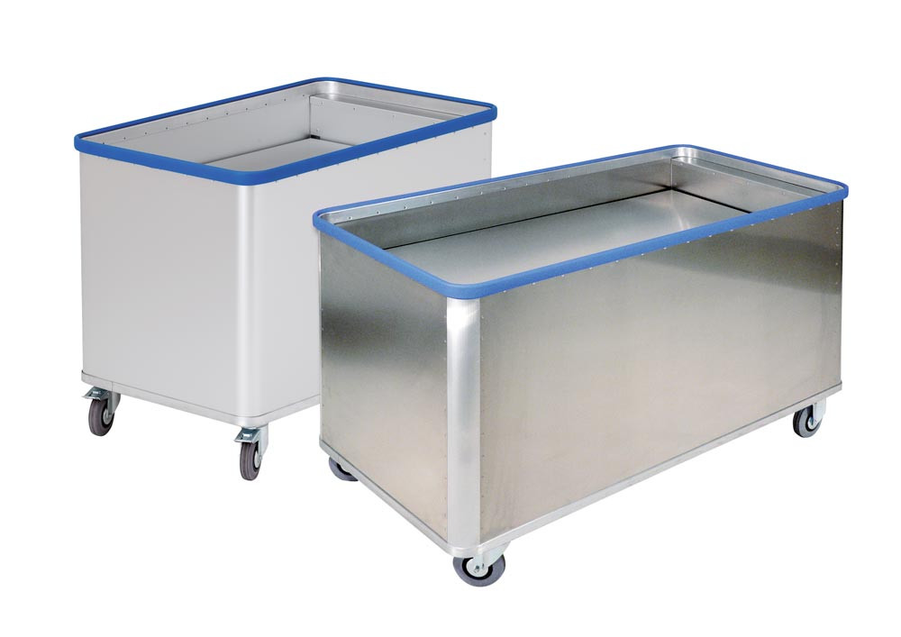 ∙ Aus Aluminium gefertigt und mit trapezförmig ausgeprägten Sicken verstärkt ∙ Umlaufende, sehr stabile Randprofile zur Verstärkung der Wände ∙ Äußerst robust und formstabil ∙ Antistatisch und schmutzabweisend ∙ 2 Lenk- und 2 Bockrollen ∙ Lenkrollen gemäß EN 1757-3 mit Rad-Feststeller