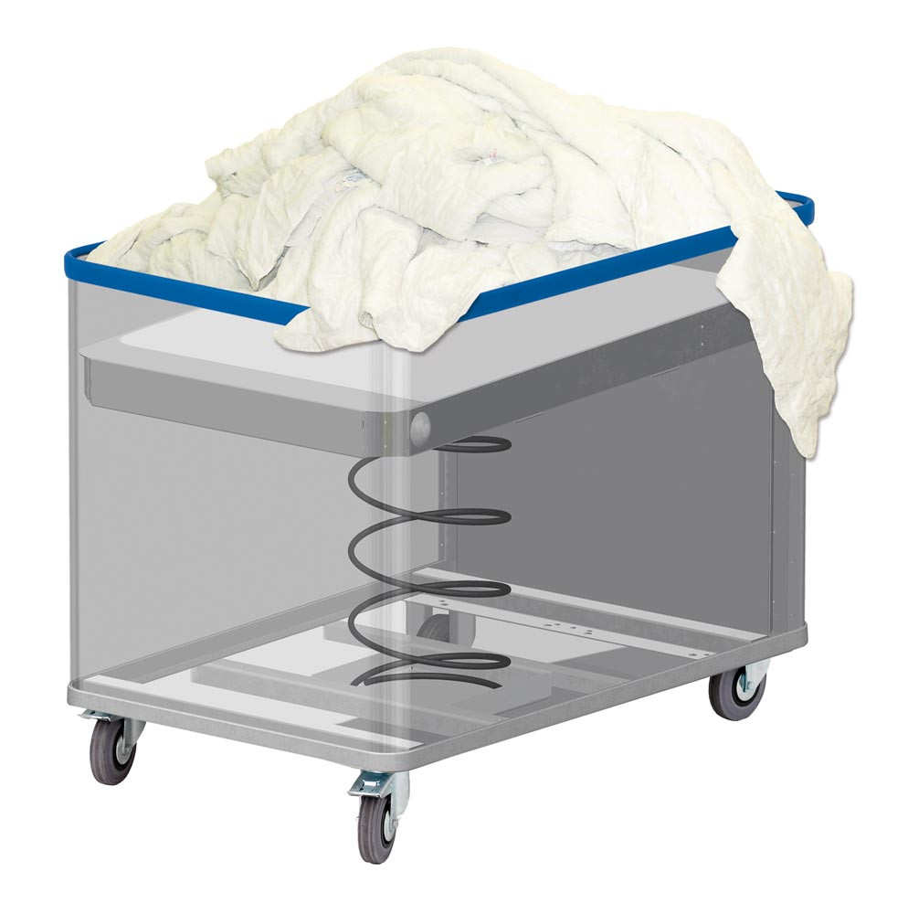 · Glatte Oberfläche · Elastischer austauschbarer Stoßschutz am oberen Randprofil · Der Boden ist federnd gelagert und wird von 8 abgedeckten Kugellagern in Spezialprofilen auch bei außermittiger Beladung parallel und verwindungsfrei geführt · Die Arbeitshöhe ist abhängig vom Gewicht der Ware - bei max. Belastung senkt sich der Boden auf niedrigste Position ab · Für einfaches Arbeiten ohne Bücken