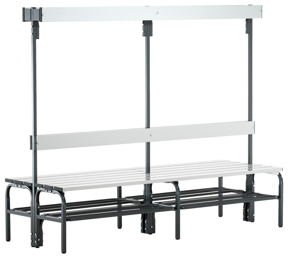 Doppelseitige Garderobenbank, Hakenleiste, mit Schuhrost, Stahl/Alu, TxH 725x1650 mm, Länge 2000 mm, RAL 7016