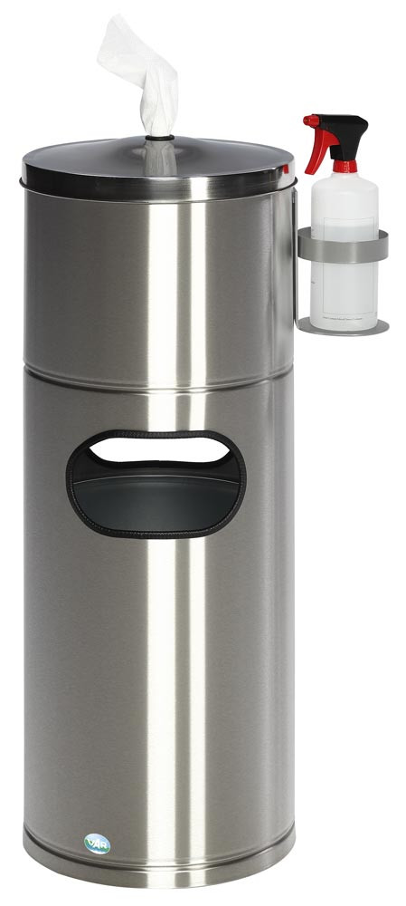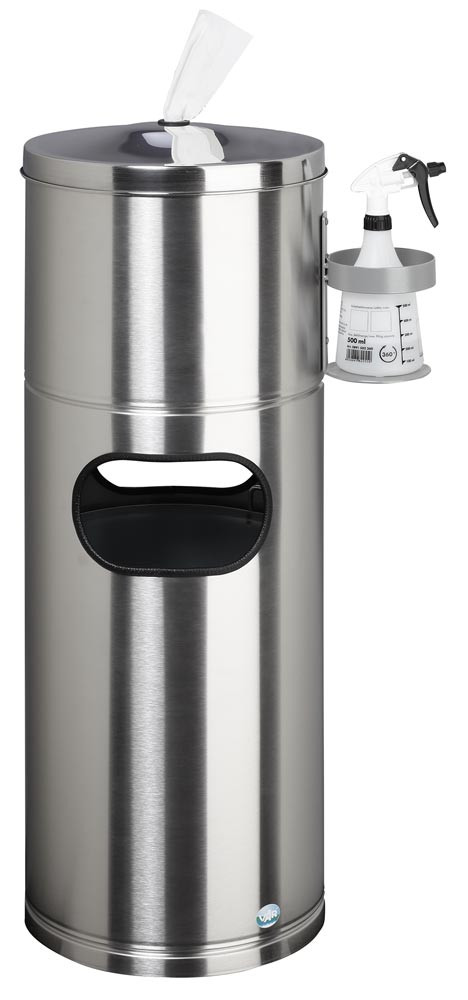 ∙ Papierspender inkl. Abfallbehälter mit Inneneinsatz (Volumen 32 l) aus verzinktem Stahlblech ∙ Seitlich angebrachter Flaschenhalter D x H 120 x 125 mm, silber beschichtet ∙ Deckel mit Öffnung (Öffnung als Schutz mit Gummitülle) für Entnahme der Papiertücher ∙ B x T x H 460 x 350 x 900 mm ∙ Gewicht 11,30 kg