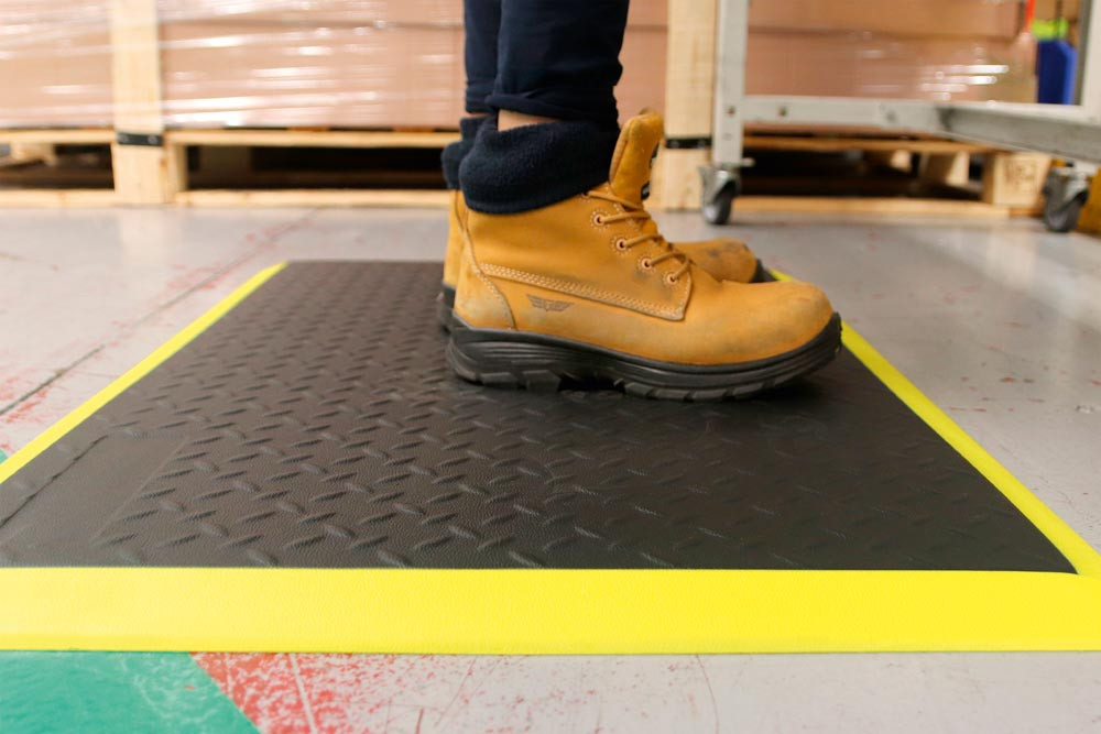 · Langlebige und ergonomische Arbeitsplatzmatte mit Rautenprofil aus Polyurethan · Stärke 18 mm · Reduzierung des Stolperrisikos durch abgeschrägte Kanten · Mit gelben Kanten für bessere Sichtbarkeit · Auf Brandverhalten nach BS EN 13501-1 geprüft und in Klasse Bfl – S1 zertifiziert · Für trockene Innenbereiche