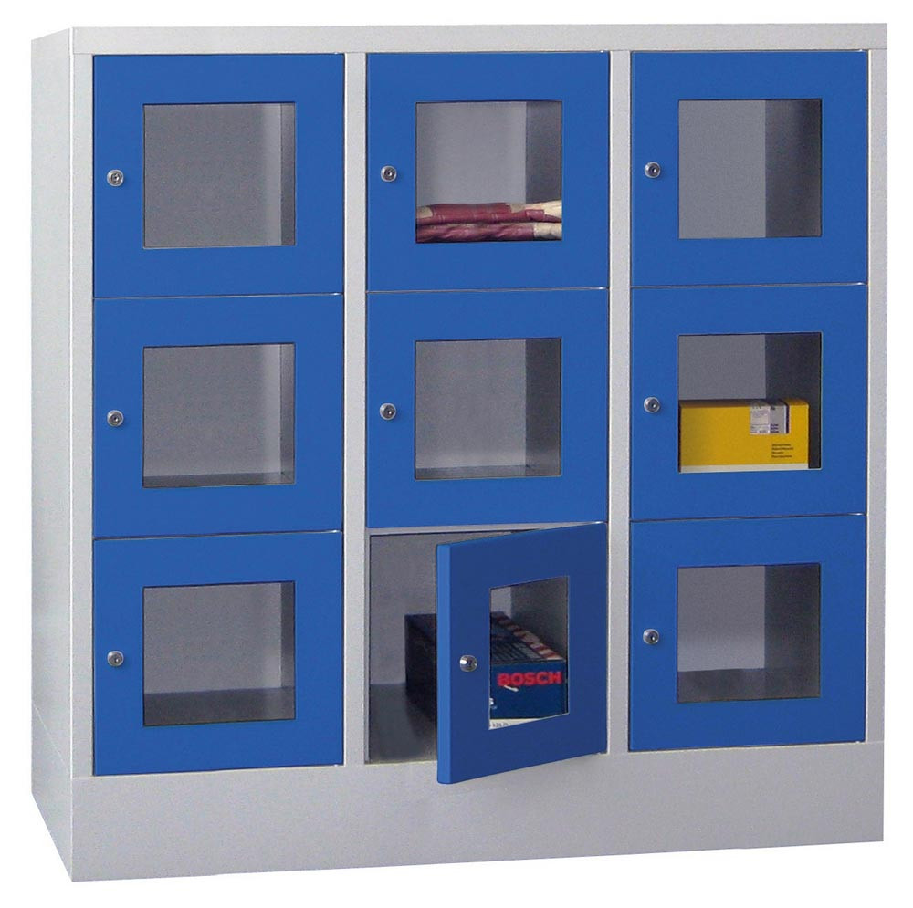 Fächerschränke mit Sichtfenstertüren, 3x3 Fächer, Schloss, BxTxH 1200x500x1187 mm, Abt. B 400 mm, RAL 7035/5010