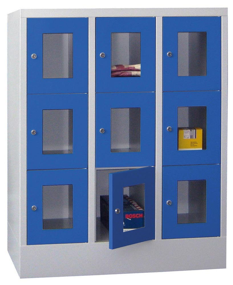 Fächerschränke mit Sichtfenstertüren, 3x3 Fächer, Schloss, BxTxH 900x500x1187 mm, Abt. B 300 mm, RAL 7035/5010