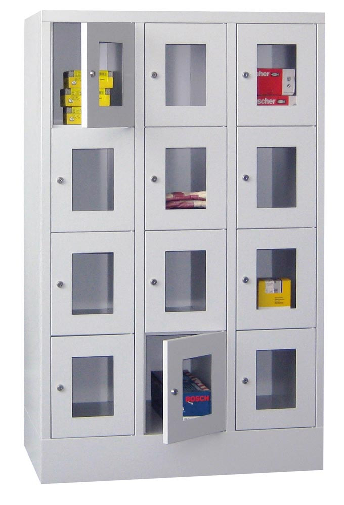 Fächerschränke mit Sichtfenstertüren, 3x4 Fächer, Schloss, BxTxH 900x500x1518 mm, Abt. B 300 mm, RAL 7035