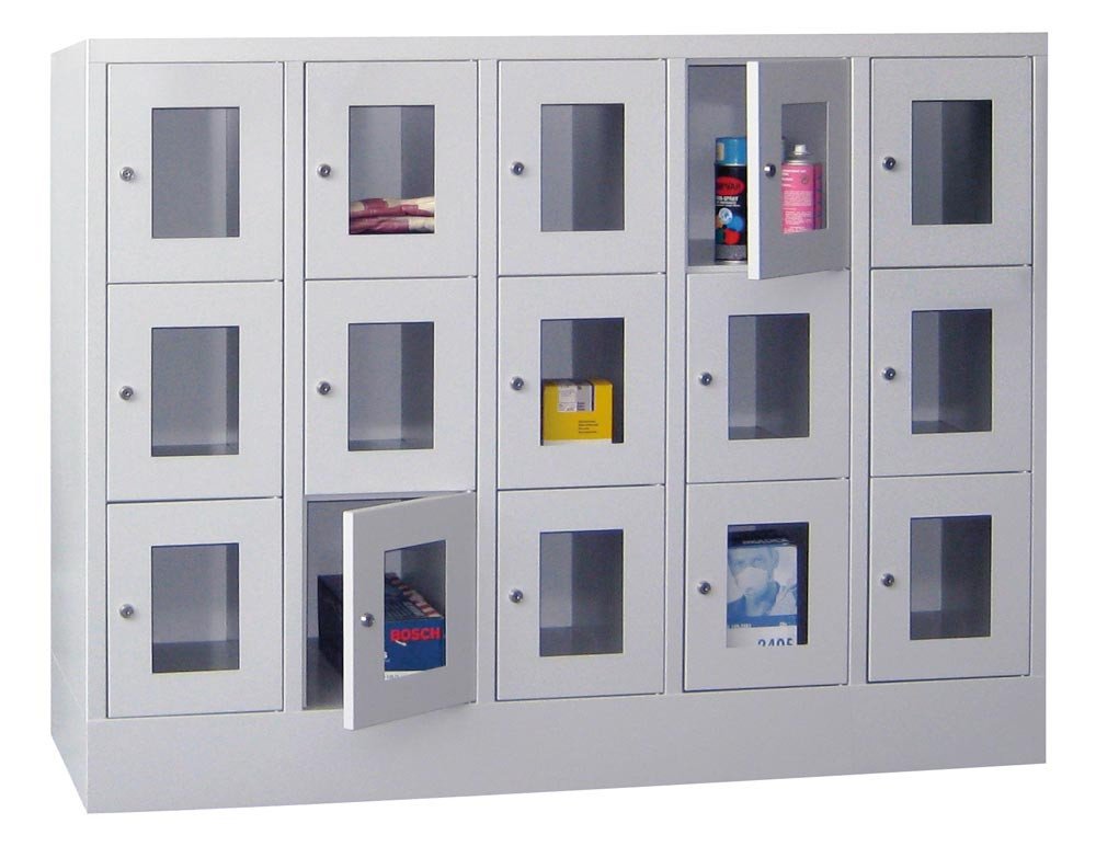 Fächerschränke mit Sichtfenstertüren, 3x5 Fächer, Schloss, BxTxH 900x500x1850 mm, Abt. B 300 mm, RAL 7035