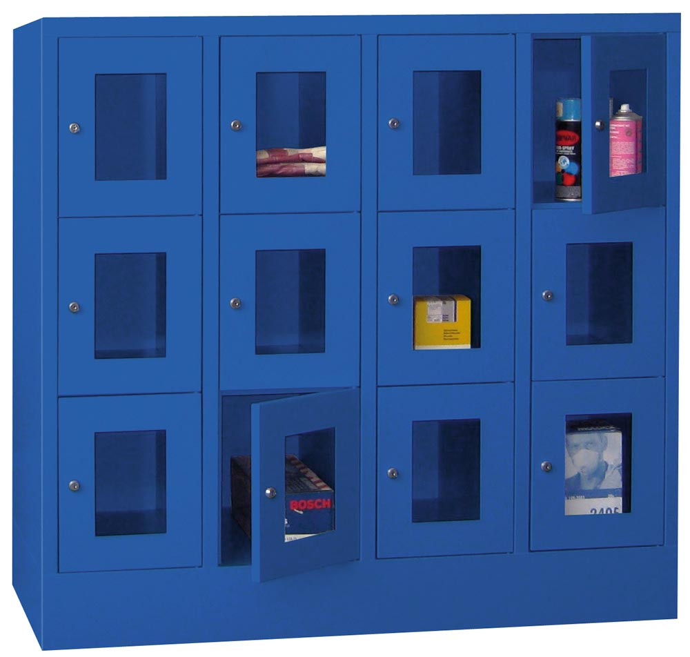 Fächerschränke mit Sichtfenstertüren, 4x3 Fächer, Schloss, BxTxH 1200x500x1187 mm, Abt. B 300 mm, RAL 5010