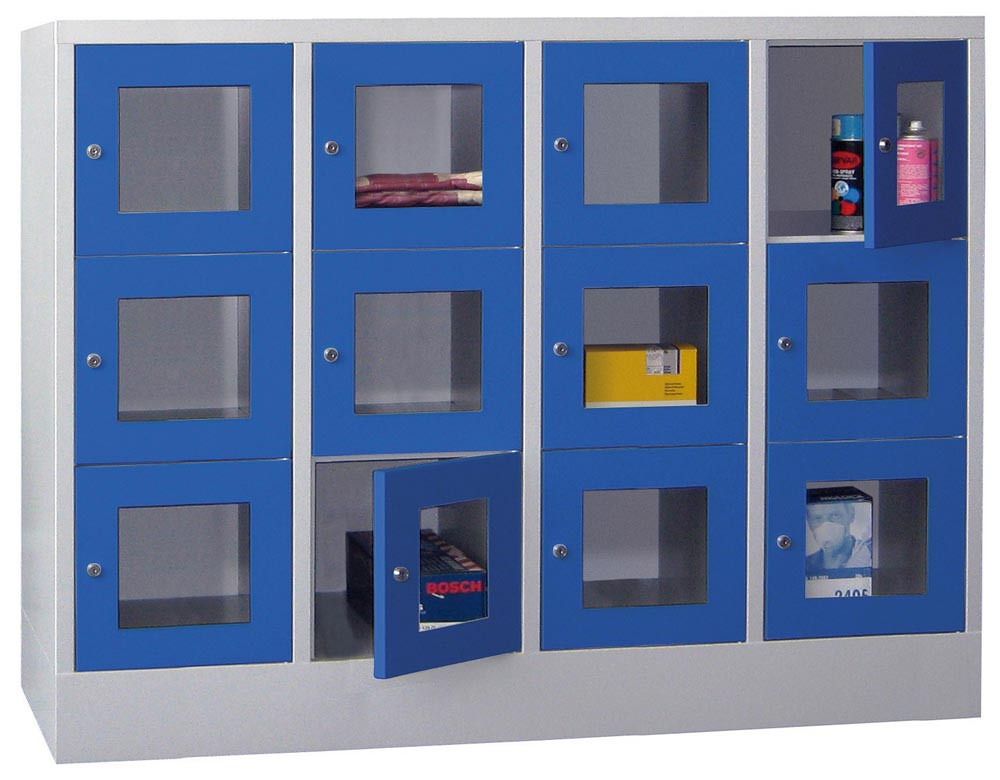 Fächerschränke mit Sichtfenstertüren, 4x3 Fächer, Schloss, BxTxH 1600x500x1187 mm, Abt. B 400 mm, RAL 7035/5010