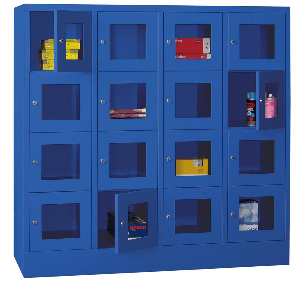 Fächerschränke mit Sichtfenstertüren, 4x4 Fächer, Schloss, BxTxH 1600x500x1518 mm, Abt. B 400 mm, RAL 5010