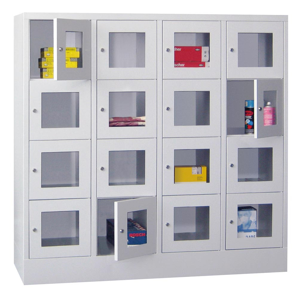 Fächerschränke mit Sichtfenstertüren, 4x4 Fächer, Schloss, BxTxH 1600x500x1518 mm, Abt. B 400 mm, RAL 7035