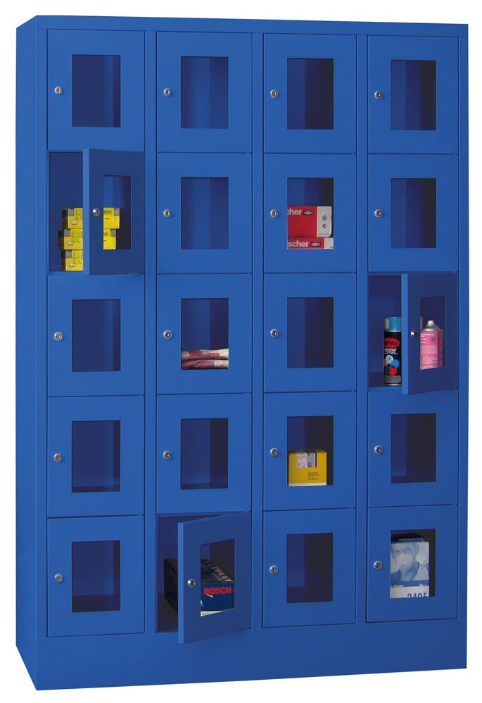 Fächerschränke mit Sichtfenstertüren, 4x5 Fächer, Schloss, BxTxH 1200x500x1850 mm, Abt. B 300 mm, RAL 5010