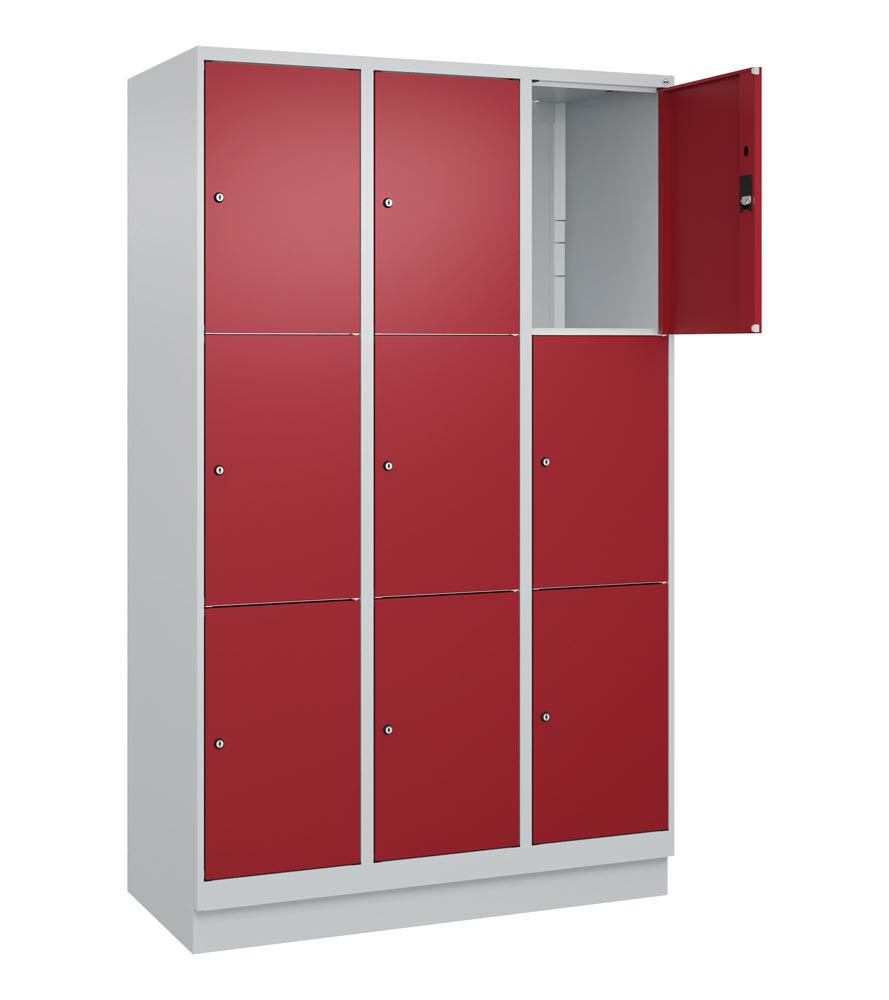 Fächerschrank, BxTxH 1200x500x1950 mm, 3x3 Fächer, Abt.B 400 mm, Sockel, Schloss, glatte Türen, Farbwahl