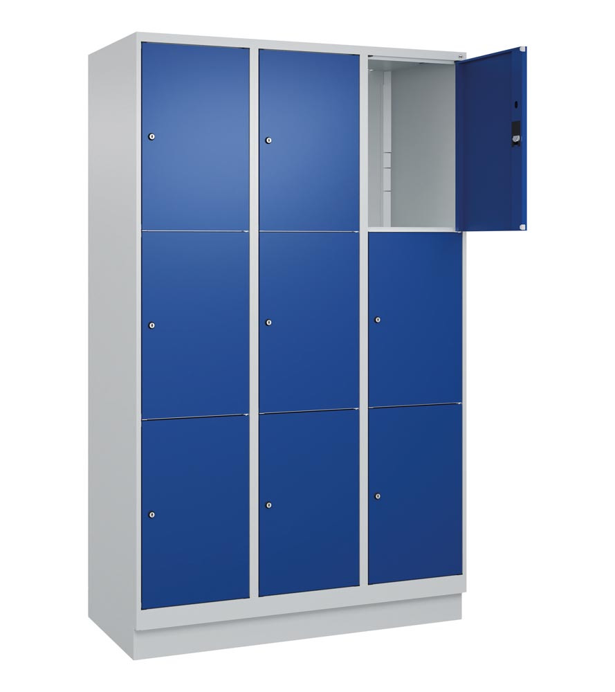 Fächerschrank, BxTxH 1200x500x1950 mm, 3x3 Fächer, Abt.B 400 mm, Sockel, Schloss, glatte Türen, RAL 7035/5010