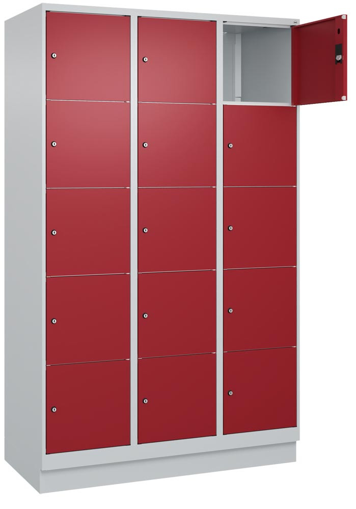 Fächerschrank, BxTxH 1200x500x1950 mm, 3x5 Fächer, Abt.B 400 mm, Sockel, Schloss, glatte Türen, Farbwahl