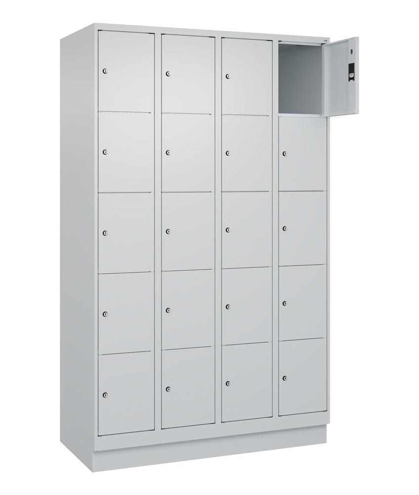 Fächerschrank, BxTxH 1200x500x1950 mm, 4x5 Fächer, Abt.B 300 mm, Sockel, Schloss, glatte Türen, RAL 7035