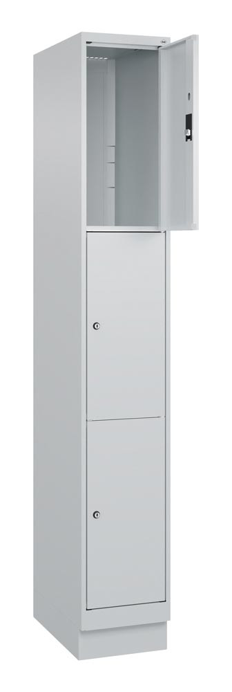 Fächerschrank, BxTxH 300x500x1950 mm, 1x3 Fächer, Abt.B 300 mm, Sockel, Schloss, glatte Türen, RAL 7035 E6479245