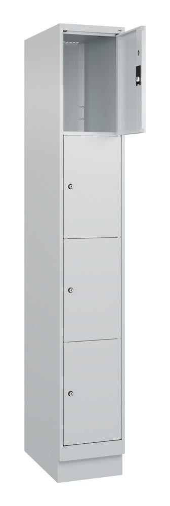 Fächerschrank, BxTxH 300x500x1950 mm, 1x4 Fächer, Abt.B 300 mm, Sockel, Schloss, glatte Türen, RAL 7035 E6479308