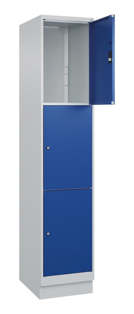 Fächerschrank, BxTxH 300x500x1950 mm, 1x3 Fächer, Abt.B 300 mm, Sockel, Schloss, glatte Türen, RAL 7035/5010 E6479246