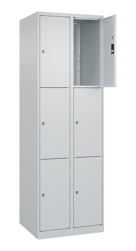Fächerschrank, BxTxH 600x500x1850 mm, 2x3 Fächer, Abt.B 300 mm, bodenstehend, Schloss, glatte Türen, RAL 7035
