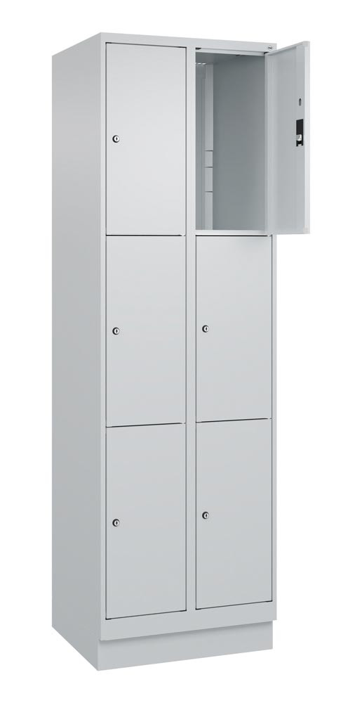 Fächerschrank, BxTxH 600x500x1950 mm, 2x3 Fächer, Abt.B 300 mm, Sockel, Schloss, glatte Türen, RAL 7035