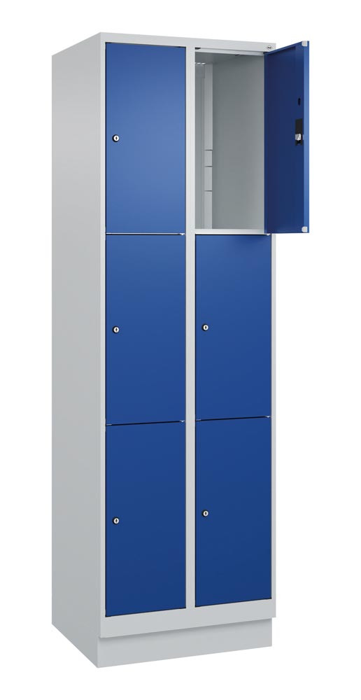 Fächerschrank, BxTxH 300x500x1950 mm, 1x3 Fächer, Abt.B 300 mm, Sockel, Schloss, glatte Türen, RAL 7035/5010 E6479246