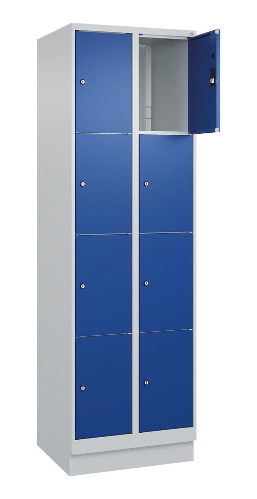 Fächerschrank, BxTxH 300x500x1950 mm, 1x4 Fächer, Abt.B 300 mm, Sockel, Schloss, glatte Türen, RAL 7035/5010 E6479309