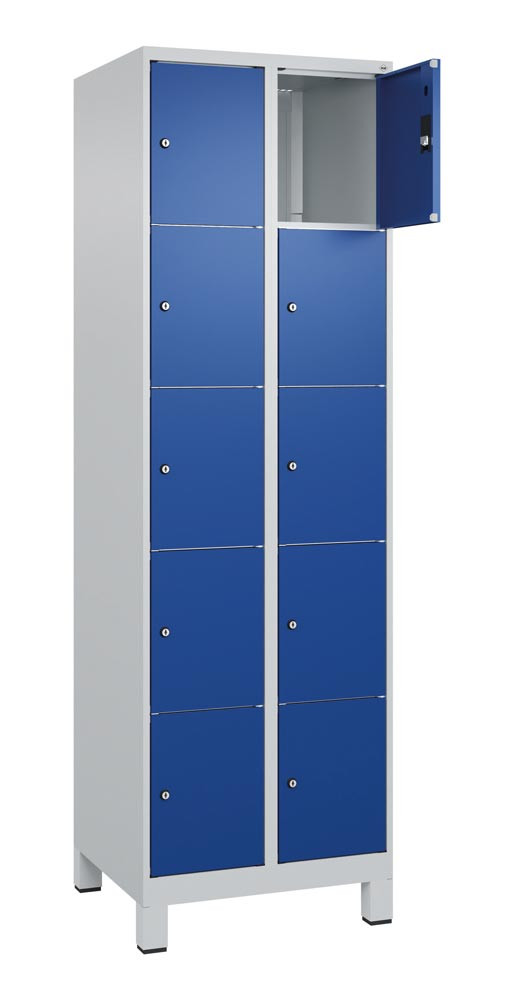 Fächerschrank, BxTxH 600x500x1950 mm, 2x5 Fächer, Abt.B 300 mm, Füße, Schloss, glatte Türen, RAL 7035/5010