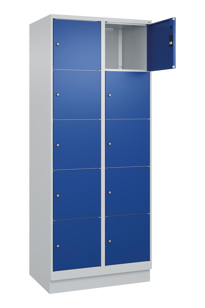 Fächerschrank, BxTxH 800x500x1950 mm, 2x5 Fächer, Abt.B 400 mm, Sockel, Schloss, glatte Türen, RAL 7035/5010