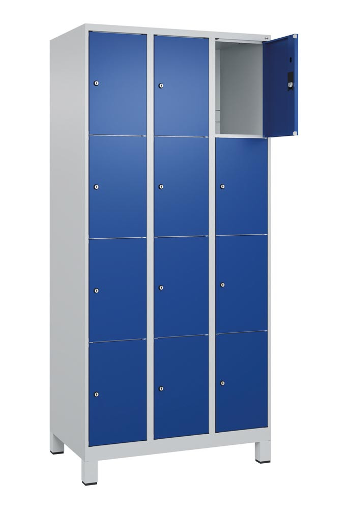 Fächerschrank, BxTxH 900x500x1950 mm, 3x4 Fächer, Abt.B 300 mm, Füße, Schloss, glatte Türen, RAL 7035/5010