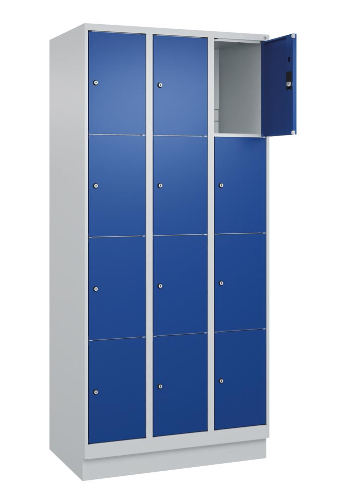 Fächerschrank, BxTxH 900x500x1950 mm, 3x4 Fächer, Abt.B 300 mm, Sockel, Schloss, glatte Türen, RAL 7035/5010