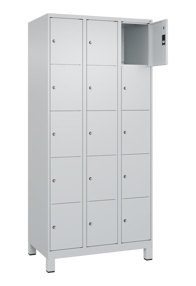 Fächerschrank, BxTxH 900x500x1950 mm, 3x5 Fächer, Abt.B 300 mm, Füße, Schloss, glatte Türen, RAL 7035