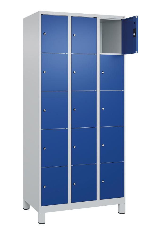 Fächerschrank, BxTxH 900x500x1950 mm, 3x5 Fächer, Abt.B 300 mm, Füße, Schloss, glatte Türen, RAL 7035/5010