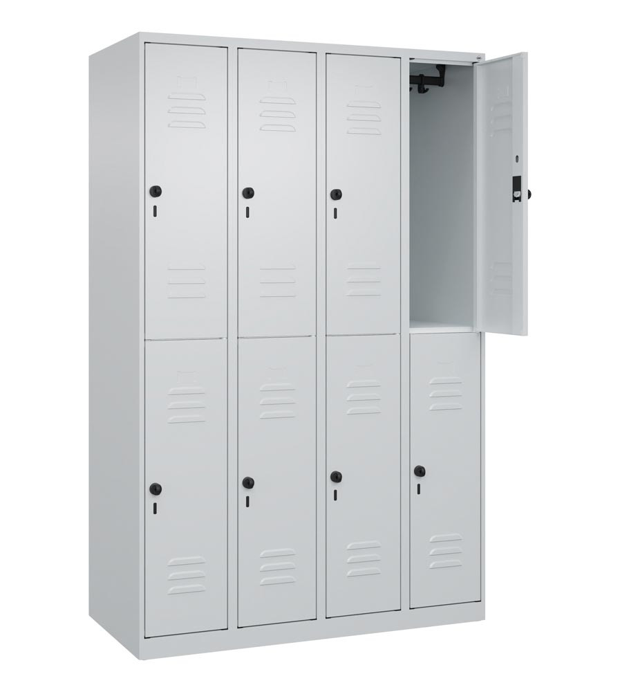 Fächerschrank, doppelstöckig, BxTxH 1200x500x1850 mm, 4x2 Fächer, Abt.B 300 mm, Drehriegel, bodenstehend, RAL 7035
