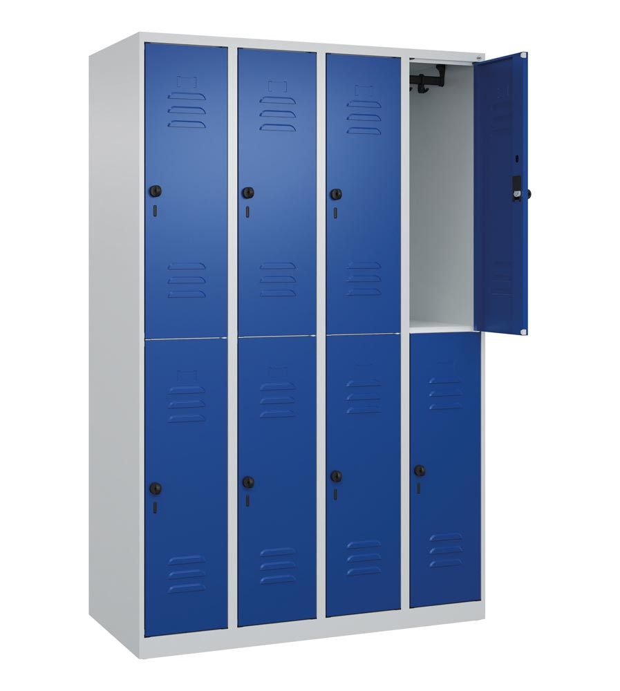Fächerschrank, doppelstöckig, BxTxH 1200x500x1850 mm, 4x2 Fächer, Abt.B 300 mm, Drehriegel, bodenstehend, RAL 7035/5010