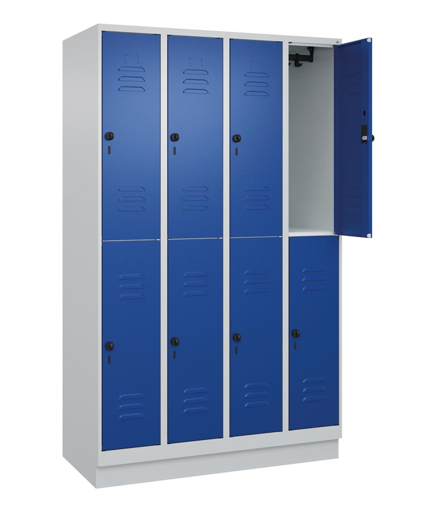 Fächerschrank, doppelstöckig, BxTxH 1200x500x1950 mm, 4x2 Fächer, Abt.B 300 mm, Drehriegel, Sockel, RAL 7035/5010