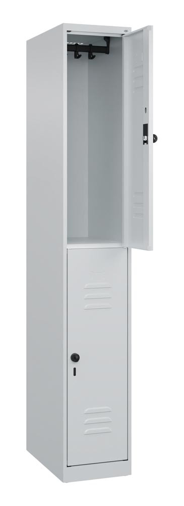 Fächerschrank, doppelstöckig, BxTxH 300x500x1850 mm, 1x2 Fächer, Abt.B 300 mm, Drehriegel, bodenstehend, RAL 7035 E6476649
