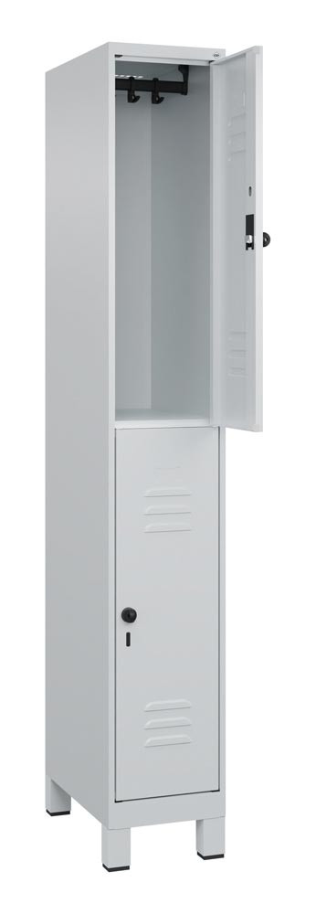 Fächerschrank, doppelstöckig, BxTxH 300x500x1950 mm, 1x2 Fächer, Abt.B 300 mm, Drehriegel, Füße, RAL 7035 E6476670