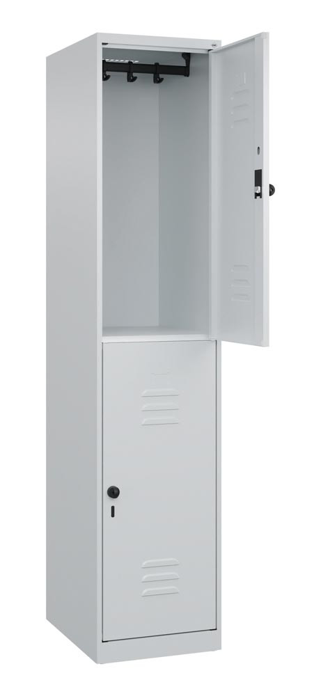 Fächerschrank, doppelstöckig, BxTxH 300x500x1850 mm, 1x2 Fächer, Abt.B 300 mm, Drehriegel, bodenstehend, RAL 7035 E6476649