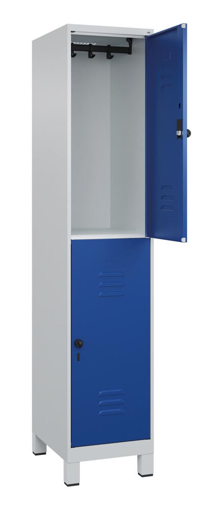 Fächerschrank, doppelstöckig, BxTxH 300x500x1950 mm, 1x2 Fächer, Abt.B 300 mm, Drehriegel, Füße, RAL 7035/5010 E6476671