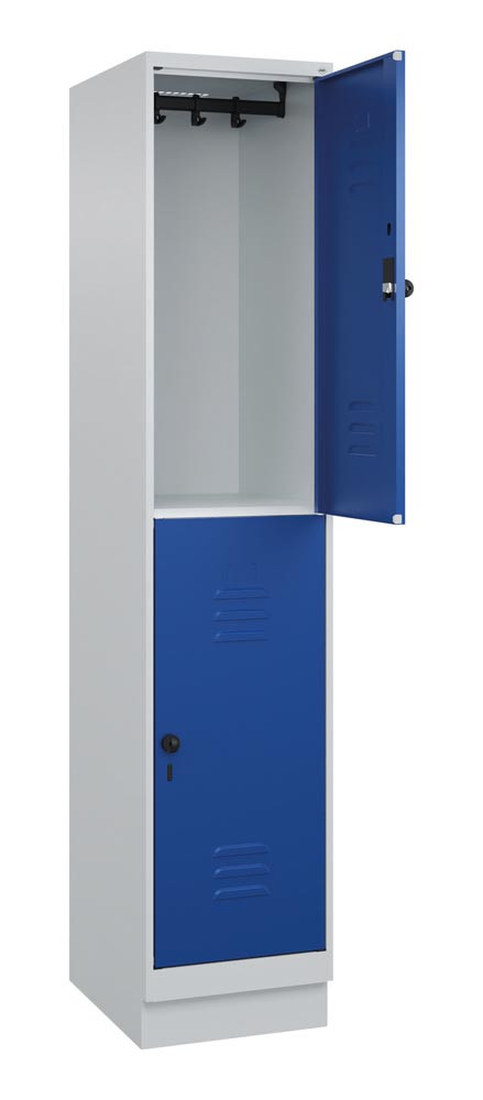 Fächerschrank, doppelstöckig, BxTxH 300x500x1950 mm, 1x2 Fächer, Abt.B 300 mm, Drehriegel, Sockel, RAL 7035/5010 E6476692