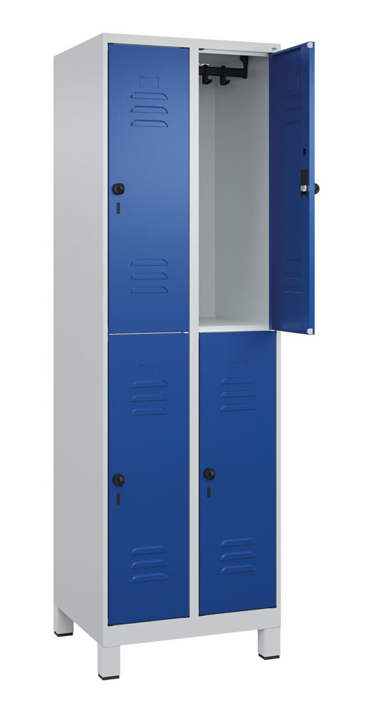 Fächerschrank, doppelstöckig, BxTxH 300x500x1950 mm, 1x2 Fächer, Abt.B 300 mm, Drehriegel, Füße, RAL 7035/5010 E6476671