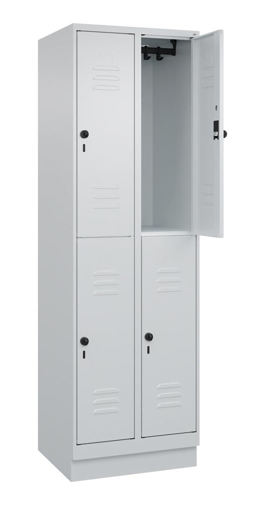 Fächerschrank, doppelstöckig, BxTxH 600x500x1950 mm, 2x2 Fächer, Abt.B 300 mm, Drehriegel, Sockel, RAL 7035
