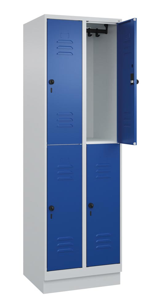 Fächerschrank, doppelstöckig, BxTxH 300x500x1950 mm, 1x2 Fächer, Abt.B 300 mm, Drehriegel, Sockel, RAL 7035/5010 E6476692