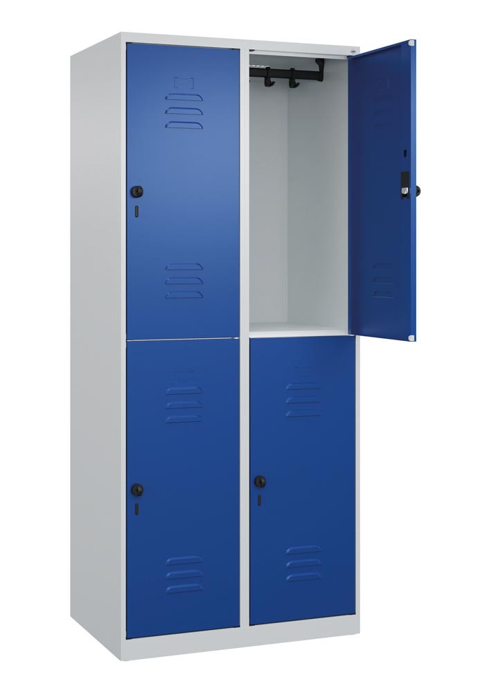Fächerschrank, doppelstöckig, BxTxH 300x500x1850 mm, 1x2 Fächer, Abt.B 300 mm, Drehriegel, bodenstehend, RAL 7035/5010 E6476650