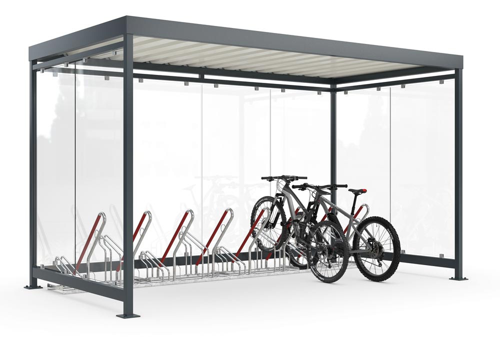 ∙ Feuerverzinkte Flachdach-Stahlkonstruktion inkl. komfortablem Anlehnsystem ∙ Schützt hochwertige Fahrräder vor Beschädigung und Diebstahl ∙ Einscheibensicherheitsglas mit Glashaltern ∙ Entwässerung erfolgt über bodenseitige Wasserspeier ∙ Für sehr hohe Wind- und Schneelasten geeignet ∙ Für Reifenbreiten bis 64 mm ∙ Inkl. Fahrradständer ∙ Ohne Überpflasterung