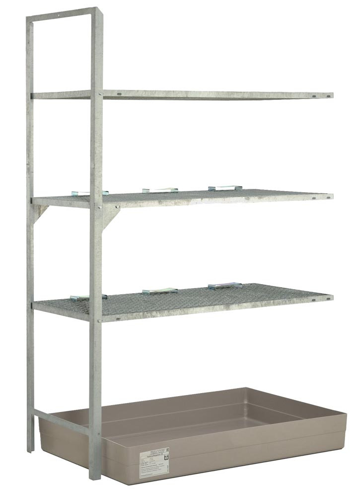 Fassregal, Stahl verzinkt, Anbaufeld mit 3 Gitterrrostebenen für 60-l-Fässer und Kleingebinde, GFK-Auffangwanne 150 l, BxTxH 1320x800x2000 mm E812116