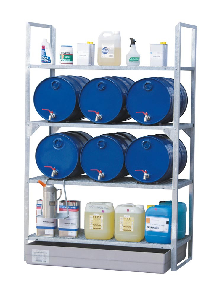 Fassregal, Stahl verzinkt, Anbaufeld mit 3 Gitterrrostebenen für 60-l-Fässer und Kleingebinde, GFK-Auffangwanne 150 l, BxTxH 1320x800x2000 mm E812116