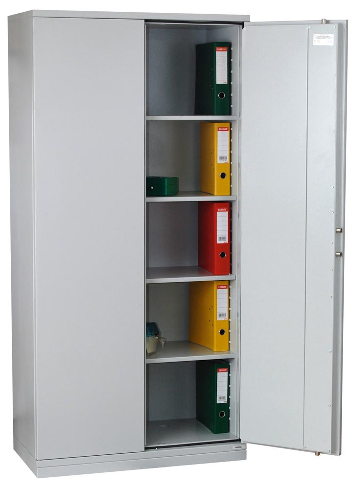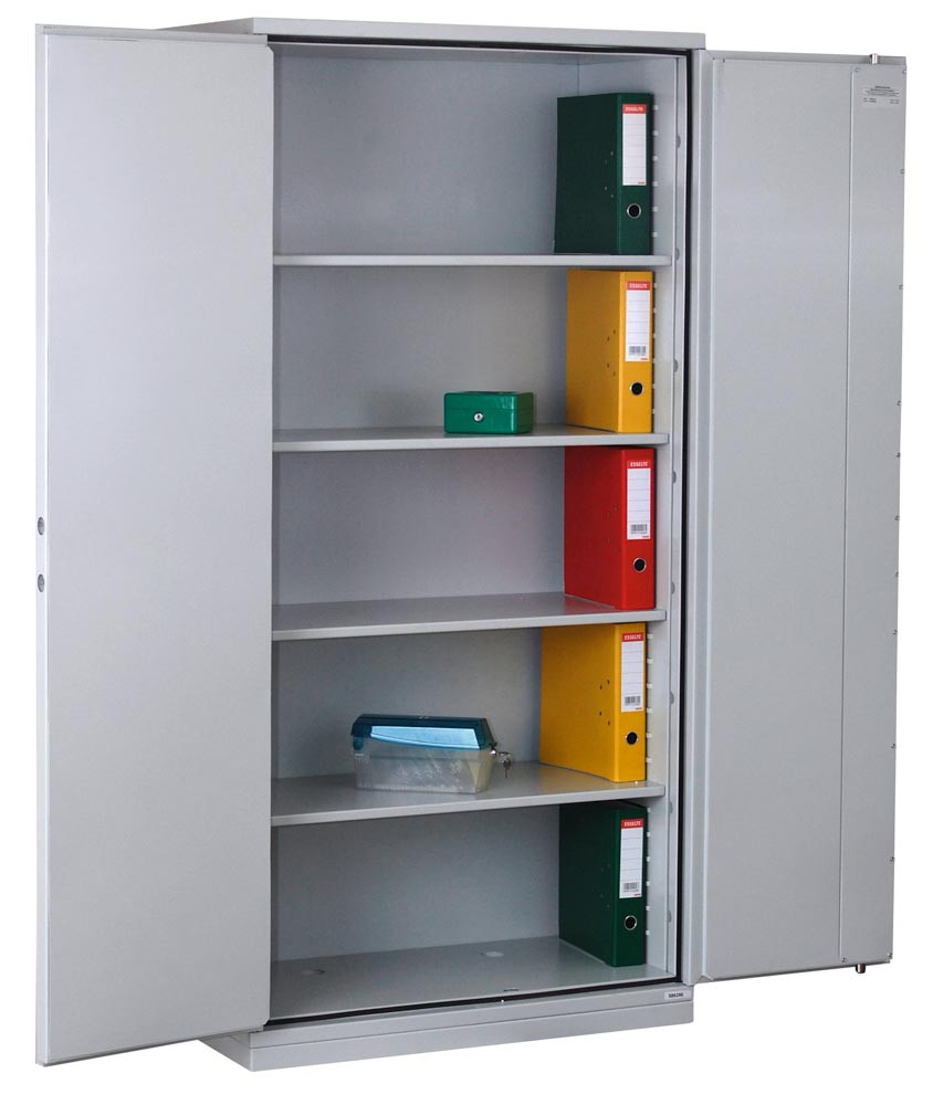Feuergeschützter Büroschrank, BxTxH 950x500x1950 mm, 2 Türen, 4 Böden, Kapazität 55 Ordner, RAL 7035 lichtgrau E1979404