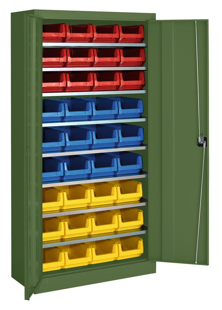 Flügeltürenschrank, BxTxH 950x420x1950 mm, RAL 6011 resedagrün, Fachlast 80 kg, mit Kästen: 8xGr. 3 rot, 8xGr. 3 blau, 12xGr. 3 gelb E861389