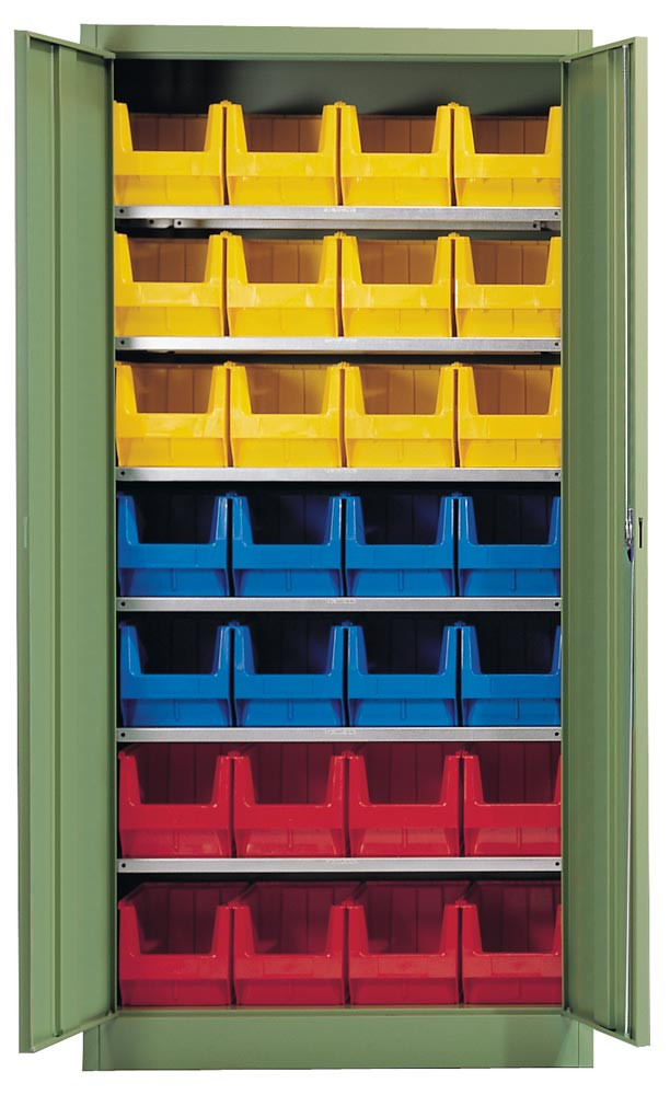 Flügeltürenschrank, BxTxH 950x420x1950 mm, RAL 6011 resedagrün, Fachlast 80 kg, mit Kästen: 8xGr. 3 rot, 8xGr. 3 blau, 12xGr. 3 gelb E861389