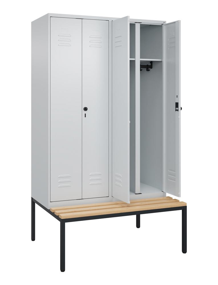Garderobenschrank, untergeb. Sitzbank, BxTxH 600x500x2120 mm, 2 Abteile, Abt.B 300 mm, Holzleisten, Drehriegel, RAL 7035/5010 E6476240